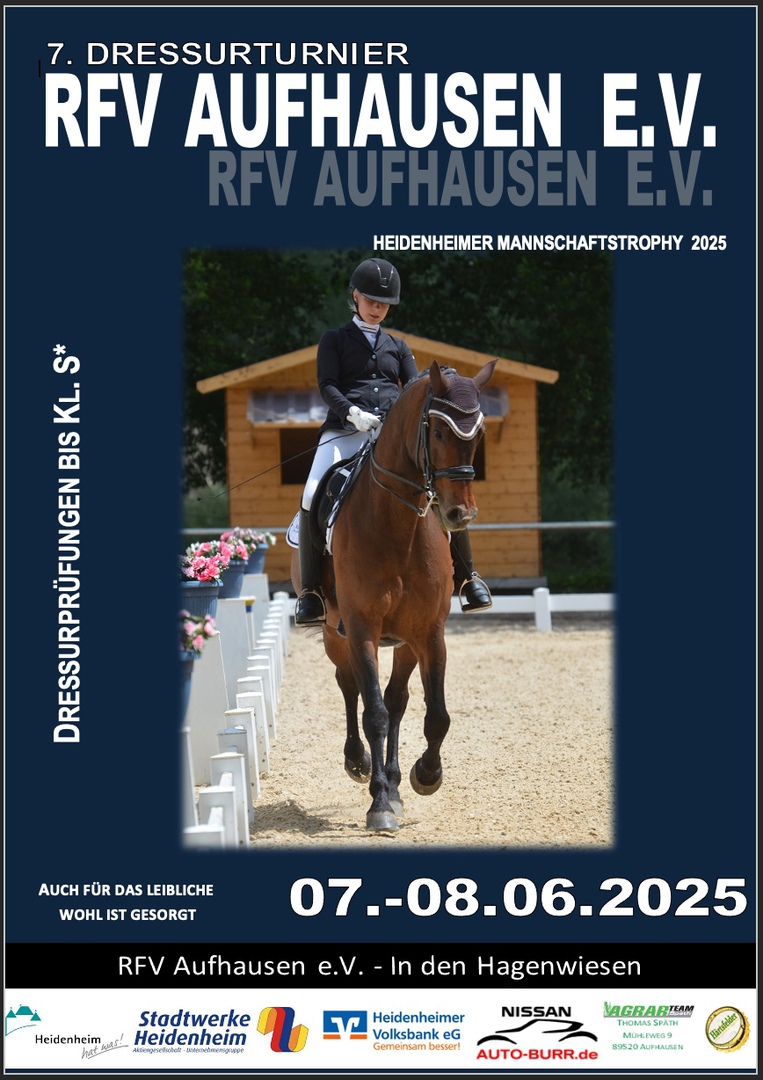 Am 30. und 31.05.2026 lädt der RFV Aufhausen e.V. erneut zum Dressurturnier mit Prüfungen bis zur Klasse S* ein. An beiden Tagen erwarten euch spannende Prüfungen auf höchstem sportlichen Niveau, darunter auch Wertungsprüfungen zur Kreismeisterschaft des PSK Heidenheim sowie eine Qualifikationsprüfung zum Bundeschampionat.